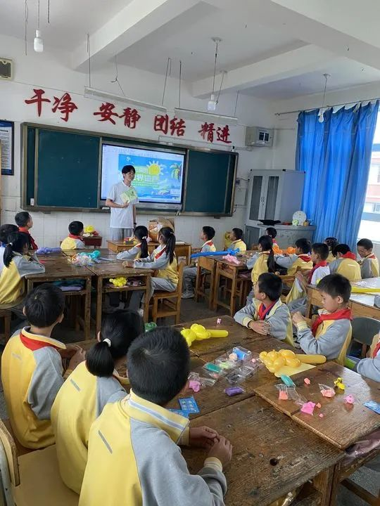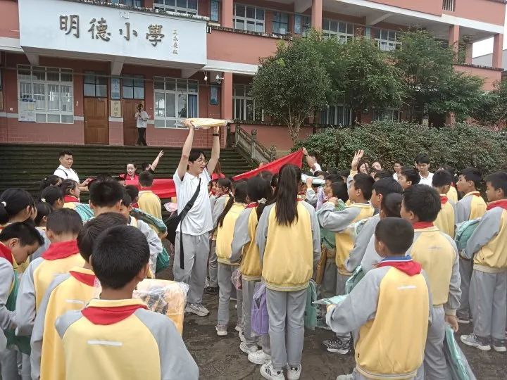 团队成员与小学生们进行了一系列的互动,将彩色卡纸和粘土制作成栩栩如生的动物,将一块块粘土塑造成各种形状,实践团队还进行了科普宣讲,通过生动有趣的讲解和互动,小学生们对科学知识有了更直观的认识,对科学探究产生了浓厚的兴趣。2008级校友张渂铄等5人随团队一起将精心准备的公益物资捐赠给明德小学。