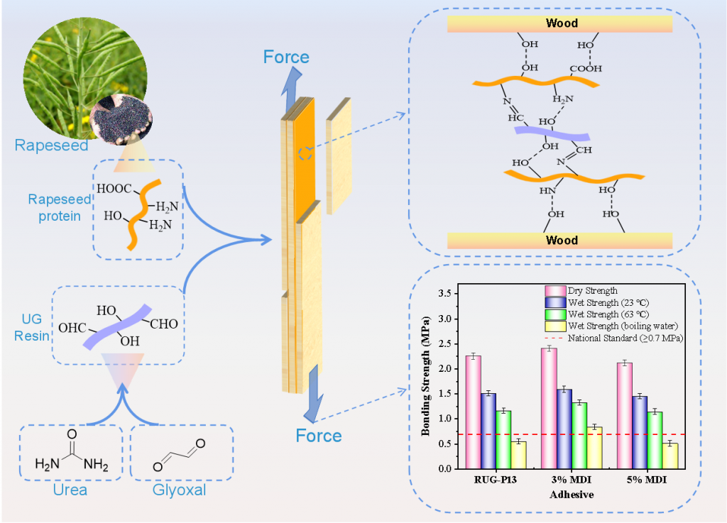 作为中国主要的油料作物,油菜产量占中国油料总量的30%以上,居世界首位。在油菜籽油料生产过程中会产生大量的油菜籽饼粕,一部分菜籽饼粕被加工成为饲料,而大部分被浪费。为充分利用副产物油菜籽饼粕,本研究独辟蹊径,以从油菜籽饼中提取的油菜籽蛋白(R)及小麦蛋白(WP)分别与乙二醛-尿素(UG)树脂进行共缩聚制备了兼具优异环保性能和高强度的ENF级胶合板用木材胶黏剂;此外,从油菜籽饼粕中提取制备出在酸性介质中对钢具有优良缓蚀作用的环保型缓蚀剂;本研究开辟了农林副产物油菜籽饼粕在人造板胶黏剂及缓蚀剂领域高值化利用的新途径。