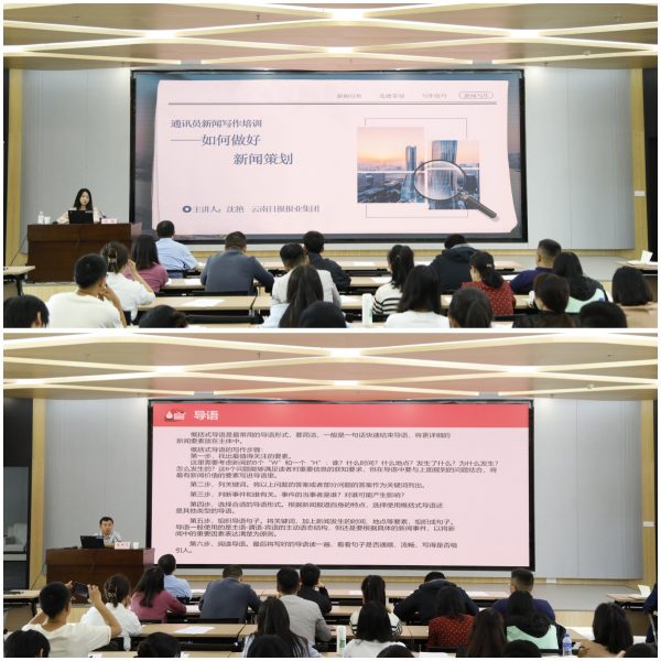 沈艳作《如何做好新闻策划》专题讲座,她根据多年从事新闻采编工作的经历,从“新闻策划的重要性”“如何进行新闻策划”“通讯员要具备何种素养”等方面进行分享。史桓恺以《新闻写作的方法与技巧》为题,从“消息写作”“新闻语言使用”“分类新闻写作”等方面作介绍。