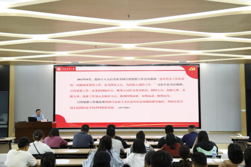 张武先以《学习贯彻习近平文化思想,切实提高新闻宣传质量》为题授课,从“深入学习贯彻习近平文化思想”“做好宣传思想文化工作的重要意义”“新闻稿件常见错误和处理”三个方面进行讲解。他就做好新时代宣传思想文化工作,承担起举旗帜、聚民心、育新人、兴文化、展形象的使命任务作介绍,对加强学校意识形态工作作要求,针对日常新闻稿件常见的文字和图片要求进行详细讲解,要求各单位严格落实学校《媒体信息发布“三审三教”制度》,加强错敏词审校,提高新闻宣传稿件质量。
