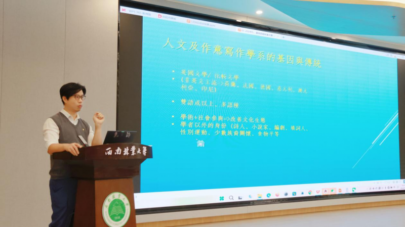 唐睿介绍香港浸会大学人文及创意写作学系的基因与传统,他从对蒲台群岛的写作经历切入到如何写作,讲述了自己如何进行实地考察和深入了解,将蒲台群岛的自然风光和人文风情融入写作中,创作出具有独特魅力的文学作品,阐述“文学散步”“city hunter”等概念,鼓励大家走出户外,寻找写作灵感,感受自然与人文的交融。