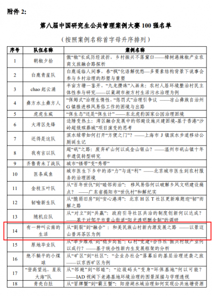 近日,经济管理学院“有一种叫云南的生活”案例“从‘割裂’到‘融合’:和美民族山村新内源发展之路——以景迈山普洱茶区为例”在第八届中国研究生公共管理案例大赛入选前百强。该项目团队由硕士研究生导师党国英、刁国炎,2022级技术经济及管理专业硕士研究生郭宇星,2023级公共管理专业硕士研究生米慧洁、廖嘉琳和朱家俊组成。