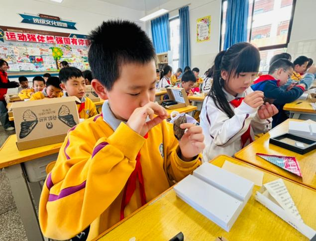 课堂上,老师以小朋友眼中的生物多样性为切入点,通过PPT及视频讲解生物标本的意义,讲解从活体昆虫观察到标本制作流程的注意事项。随后,在志愿者们的带领下,同学们积极参与,认真制作蝴蝶标本。在制作过程中,小朋友们仔细观察蝴蝶的形态、颜色和纹理,深入了解蝴蝶的生活习性和生态环境。