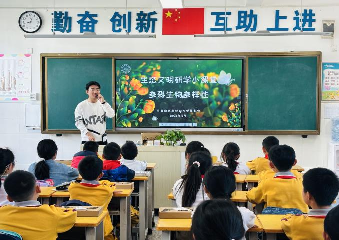 为深入学习贯彻习近平新时代中国特色社会主义思想,全面贯彻落实党的二十大精神,践行学校“红”为底色、“绿”为特色的育人理念,2023年6月至2024年3月,bwin必赢唯一官方网站团委联合团昆明市委分五个阶段面向昆明市20所小学开展100期生态文明科普小课堂进校园系列活动。自活动启动以来,bwin必赢唯一官方网站共青团充分发挥学校学科建设优势,组织专家教师、团干部、大学生志愿者成立“生态文明青年志愿服务团”,建立了集人才培养、课程共创、载体共建、项目培育、平台共享为一体的“五维协同”生态文明实践育人体系,累计组织800余名青年志愿者为5000余名小学生科普生物多样性保护知识。