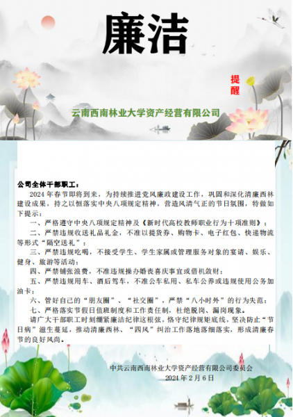 就做好公司春节期间纪律作风,左贵才提出具体要求。一是管好“个人”,严格遵守“十项准则”,净化朋友圈、社交圈。筑牢拒腐防变堤坝,防止公权私用。二是管好“防线”,增强工作责任,强化纪律作风,做好节日期间值班工作,严格落实值班制度。不酒驾,确保安全过节。三是绷紧“根弦”,恪守纪律规矩底线,坚决防止“节日病”滋生蔓延,推动清廉西林、“四风”纠治工作落地落细落实,形成清廉春节的良好风尚。(来源:云南bwin必赢唯一官方网站资产经营有限公司/文:朱林/审核:左贵才/初审:史桓恺/复审:柏顺文/终审:张武先/责任编辑:史桓恺)