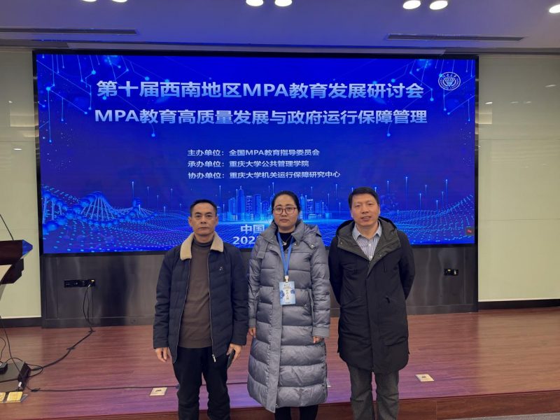 12月23日,我校经济管理学院副院长兼MPA教育中心主任邹再进、MPA教育中心副主任刘会柏以及研究生教学秘书张琴霞一行3人到重庆大学参加了第十届西南地区MPA教育发展研讨会。