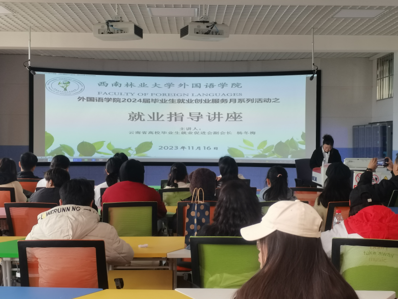 为帮助学生树立正确的就业观,找准就业方向,增强就业信心,11月16日,外国语学院特邀云南省高校毕业生就业促进协会副会长杨冬梅老师作就业指导专题讲座。学院院长何新元、学院党委副书记李法营与同学一道聆听讲座。