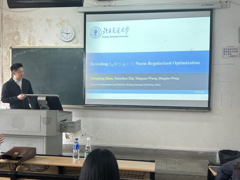 周声龙教授以“Lq范数正则化优化”为汇报主题,重点介绍了Lq范数正则化的稀疏优化问题。以Lq范数的近端算子的性质,提出了PSNP算法,证明了目标函数的超线性和二次的收敛性。并演示了PSNP算法在压缩感知和SVM这两个实例中应用。周声龙教授的报告内容从浅到深,简明清晰,拓宽了学生们的知识面,引起了在场师生的热烈讨论,也为大家的科研工作和未来发展提供了深刻的借鉴意义。