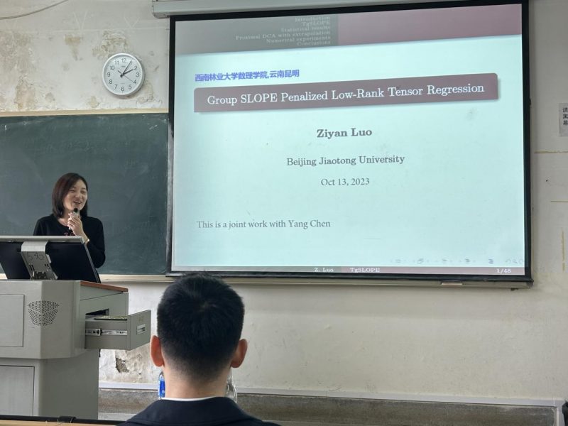近日,北京交通大学数学与统计学院罗自炎教授和周声龙教授应邀分别为我院师生作了题为《Group SLOPE Penalized Low-Rank Tensor Regression》《Revisiting Lq (0 ≤ q < 1) norm regularized optimization》的专题讲座。活动由数理学院副院长张雁主持,数理学院和大数据智能工程学院的师生参加讲座。