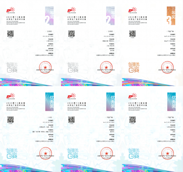 在2023年全国大学生广告艺术大赛中,由我院教师王艳、何蕊、陈露、向鹏、姚欣楠、代沁伶、李兴蓉、杨柳春等老师指导的学生共获得省级一等奖2项,二等奖6项,三等奖11项,优秀奖45项。进入国赛后由向鹏老师指导的学生张芮、徐洋参赛作品《小葵花日记》,姚欣楠老师指导的学生艾迪、高丝琪参赛作品《青春古镇丰惠游礼》喜获国赛二等奖,向鹏老师指导的学生刘琳参赛作品《绘出不一样的精彩》喜获国赛三等奖,何蕊、陈露、向鹏、姚欣楠老师指导的学生还分别荣获国赛优秀奖6项。