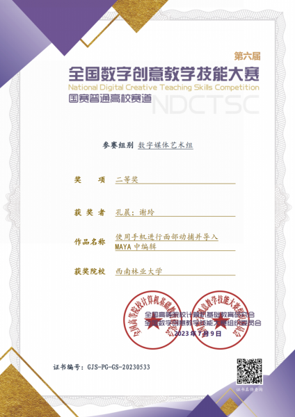 在第六届全国数字创意教学技能大赛中,学院数字媒体系教师孔晨、谢玲获得第六届全国数字创意教学技能大赛国赛高校赛道数字媒体艺术组二等奖。