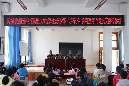 地理与生态旅游学院组织9名学生骨干成立2023年暑期“三下乡”社会实践志愿服务队,于7月16日至19日到国门小学腾冲市明光镇自治完小开展“大手牵小手 拥军且爱民”2023年暑期生态文明科普教育夏令营活动。