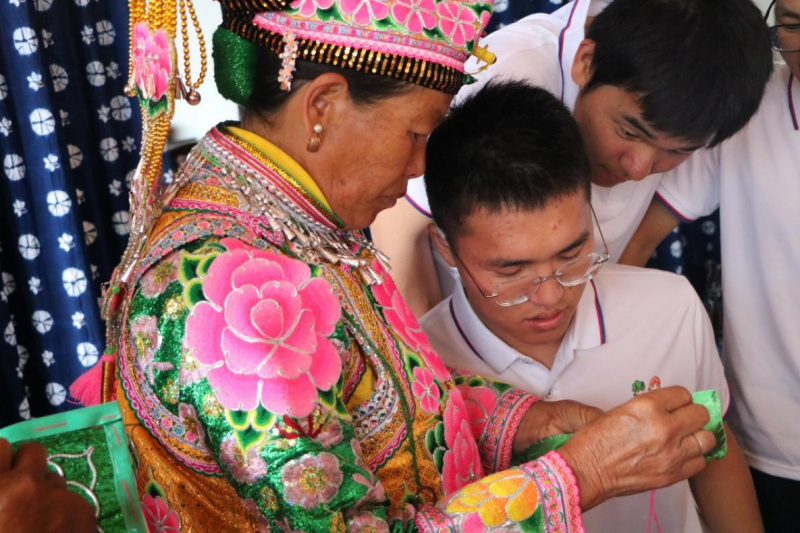 7月5日,数理学院“三下乡”社会实践活动第二站来到大理巍山县民族团结进步示范村——大三家村,实践团队的队员们在村长的带领下,了解彝族刺绣这一非遗项目,并身着彝族服饰体验刺绣。