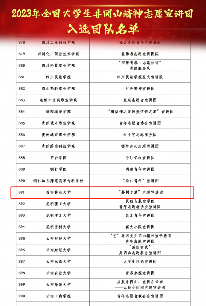 近日,团中央青年志愿者行动指导中心、全国青少年井冈山革命传统教育基地、井冈山管理局联合发布《2023年全国大学生井冈山精神志愿宣讲团入选团队名单》。我校艺术与设计学院“藝树之麓”志愿宣讲团从全国650所高校的1615支团队中脱颖而出,成功入选。
