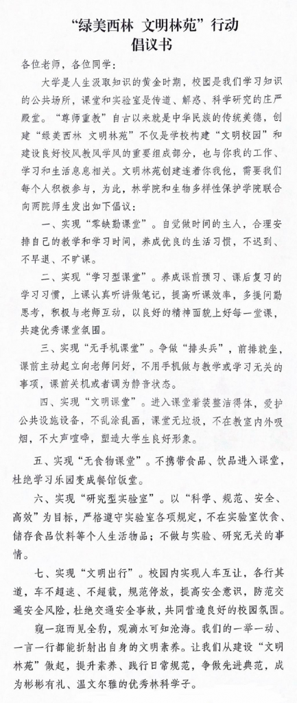 “绿美西林 文明林苑”行动从5月8日开始,在林学楼及周边范围内开展了为期一个月的值班,目前已取得可喜成果,师生文明行为逐步养成,不文明现象日趋减少,主题教育真正落在了实处。