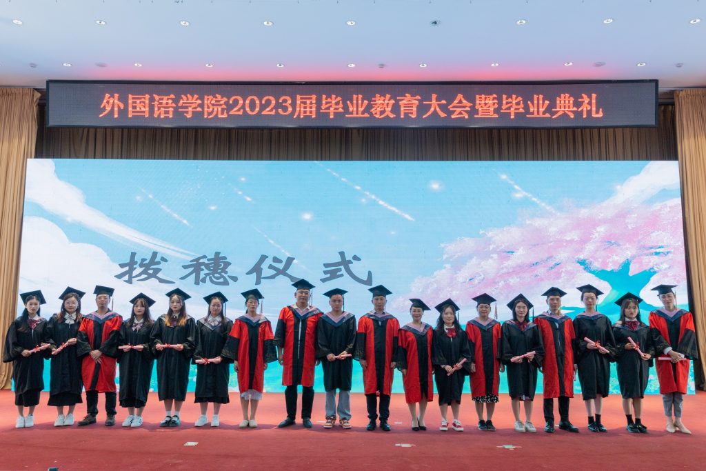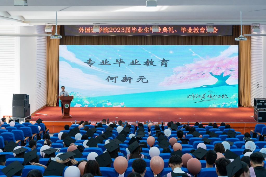 为做好2023届毕业生离校教育工作,推动2023届就业创业工作的开展,5月19日,外国语学院举行2023届毕业教育暨毕业典礼。学院党委书记姜丽红、院长何新元、党委副书记李法营,各系部主任及专业负责人、团学老师、辅导员、班主任及2023届全体毕业生参加典礼。
