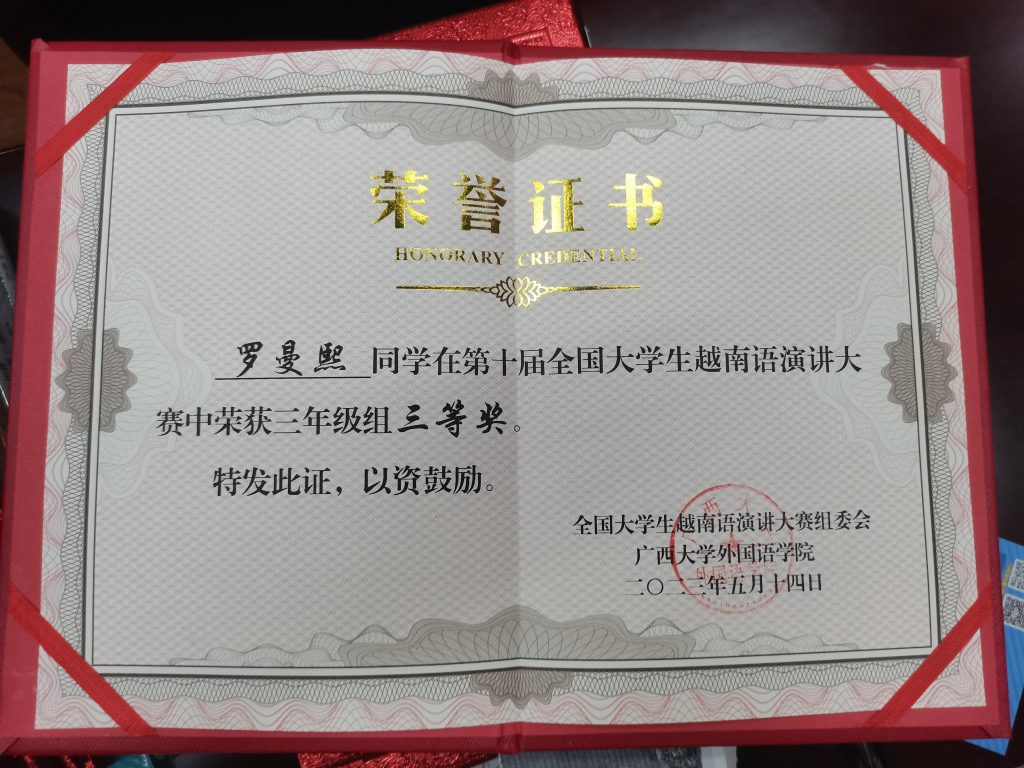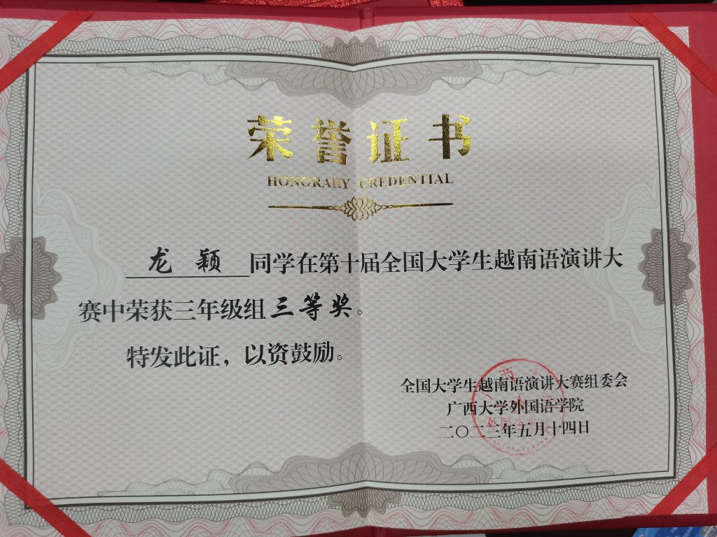 5月12日至14日,第十届“世图杯”全国大学生越南语演讲大赛暨越南语教学研讨会在广西大学举办。我校2020级越南语专业学生龙颖和罗曼熙在三年级组比赛中,从40多名参赛选手里脱颖而出,喜获三等奖。