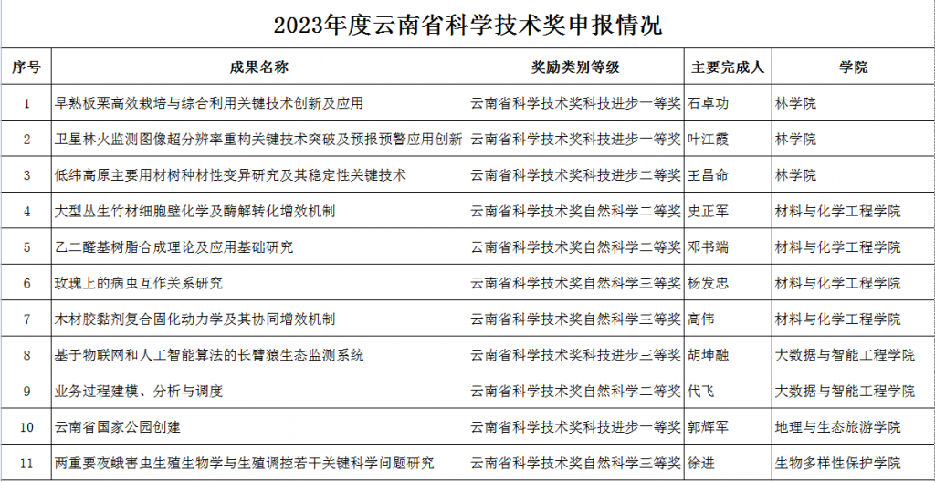 根据《云南省科学技术奖励办法》(云南省人民政府令第224号)和《云南省科技厅关于印发云南省科学技术奖励实施细则的通知》(云科规〔2022〕12号)的精神和要求,科技处在全校范围内广泛动员,围绕学校骨干学科重点组织了2023年的省科学技术奖的推荐提名工作,经形式审查、公示无异议后,共有11项成果推荐参加省科学技术奖评选。