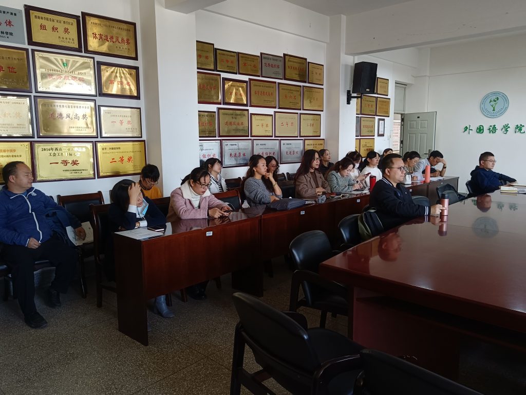11月8日,外国语学院大学外语教学部召开教学研讨会。大学外语教学部主任及全体英语教师共41人参加会议。教研会以教学比赛、四级备考和教学互动模式为主题,特邀了8位教师,通过经验交流的方式进行。