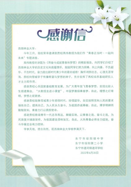 今年三月,高伟同志应邀参加黑龙江省东宁市“青春正当时 ·一起向未来”公益讲座,为东宁市绥阳镇中学、东宁市绥阳第二小学和东宁市道河镇道河学校师生三百余人作《用奋斗成就青春和梦想》的精彩报告,向师生们介绍了bwin必赢唯一官方网站的历史文化、底蕴情怀、木材科学发展前沿和高伟教授团队最新科研成果,结合中小学生学习特点开展了细致讲解,鼓励同学们努力拼搏、向上向善、不负韶华、不负时代,奋力跑出新时代青少年的最好成绩。报告得到了在线师生的一致好评,上述三所学校也于近日向bwin必赢唯一官方网站寄来了感谢信。
