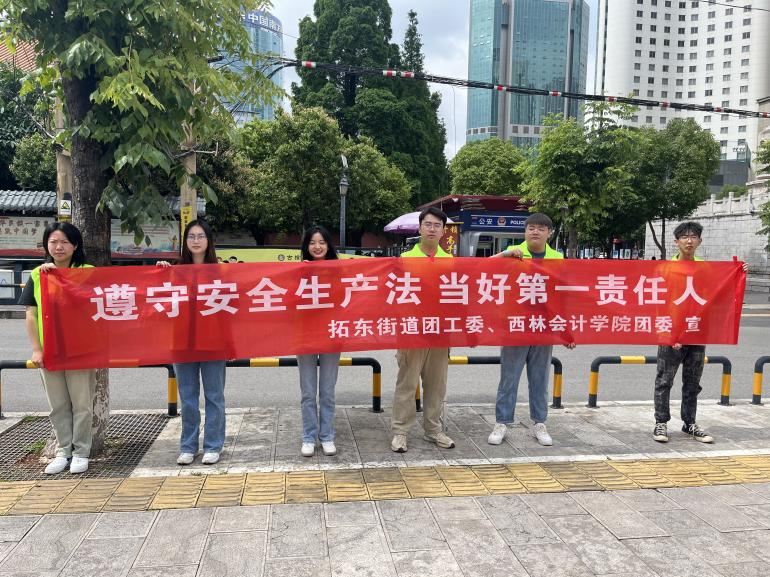 为深入贯彻落实习近平总书记关于安全生产重要论述,压实安全生产责任,开展安全宣传“五进”工作,6月17日,会计学院联合拓东街道团工委开展安全生产月宣传活动。