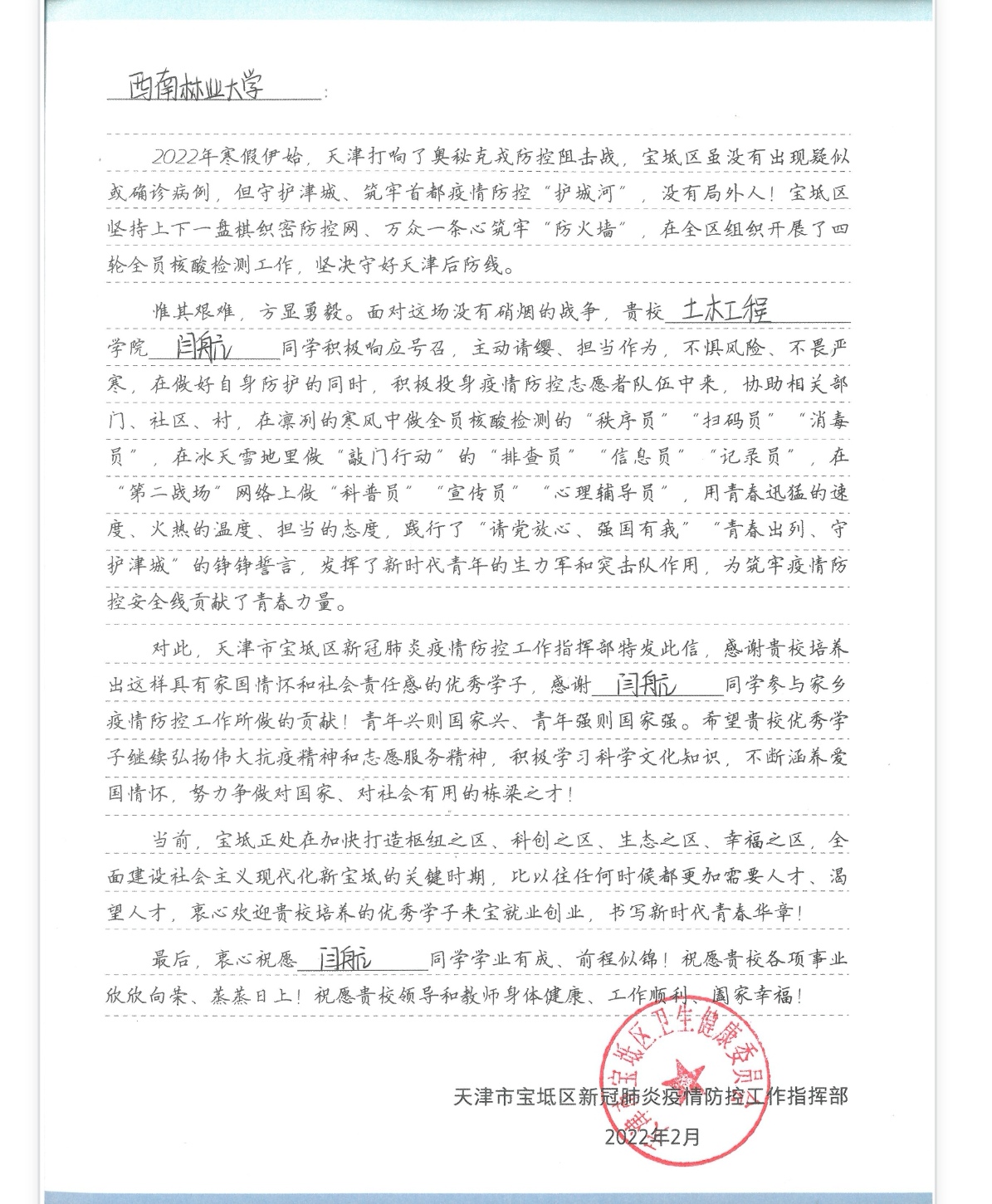 天津市宝坻区新冠肺炎疫情防控工作指挥部致信学校,对土木工程学院闫航同学积极响应号召、主动请缨、担当作为,不惧风险、不畏严寒,在做好自身防护的同时,积极投身疫情防控志愿者队伍中表示感谢。感谢信中说道:闫航同学协助相关部门、社区、村,在凛冽的寒风中做全员核酸检测的“秩序员”“扫码员”“消毒员”,在冰天雪地里做“敲门行动”的“排查员”“信息员”“记录员”,在“第二战场”网络上做“科普园”“宣传员”“心理辅导员”,用青春迅猛的速度、火热的温度,担当的态度,践行了“请党放心,强国有我”“青春初恋、守护津城”的铮铮誓言,发挥了新时代青年的生力军和突击队作用,为筑牢疫情防控安全线贡献了青春力量。感谢闫航同学参与家乡的疫情防控工作所做的贡献。
