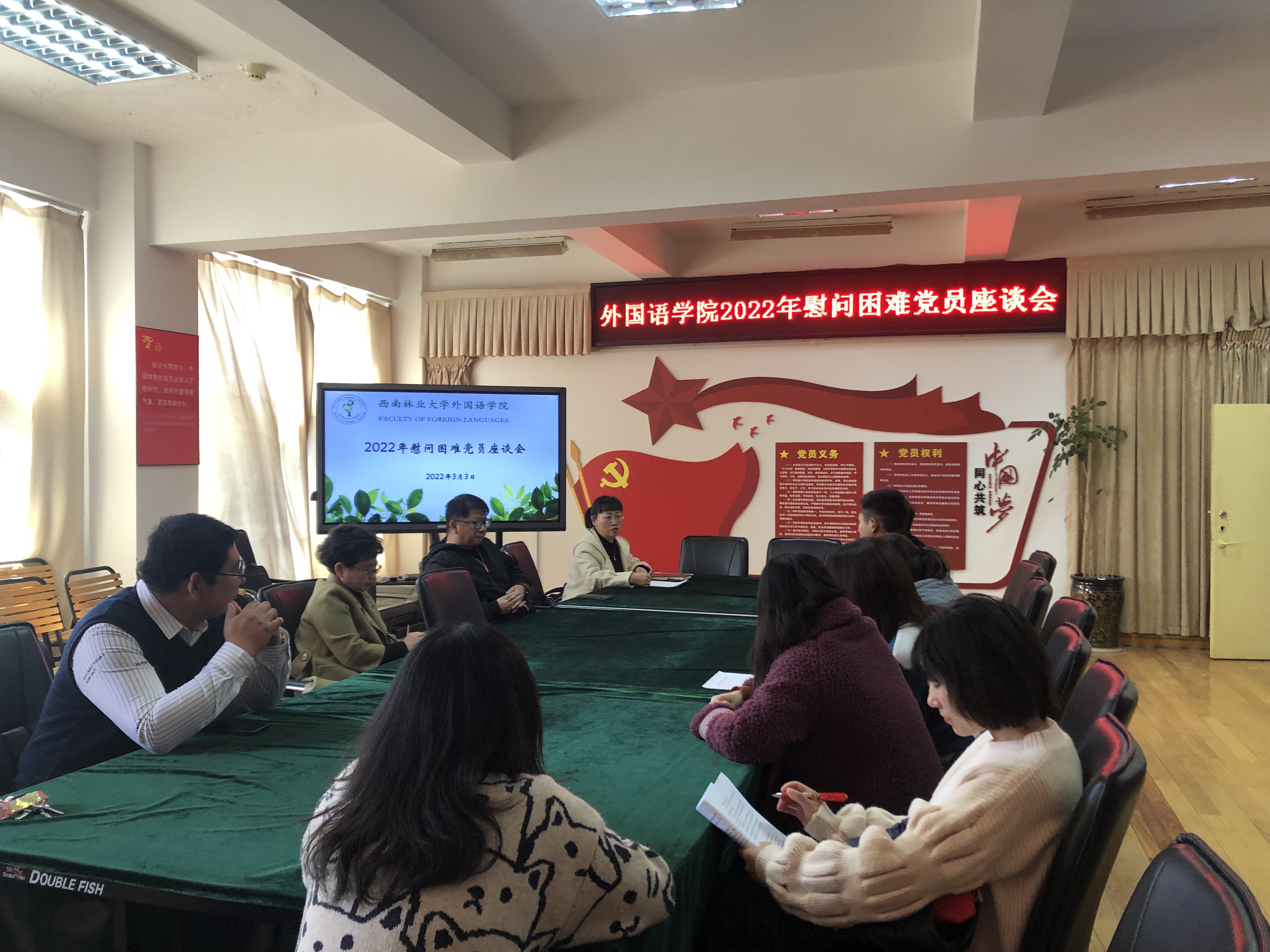 为做好慰问困难党员工作,3月3日,外国语学院召开了慰问困难党员座谈会。学院领导、党支部书记及2名师生困难党员参加了座谈会,学院党委书记姜丽红主持会议。