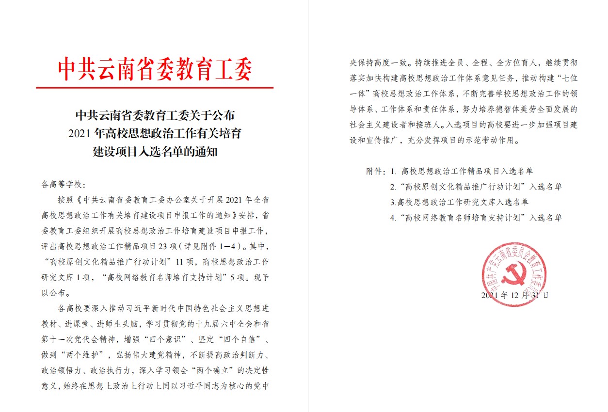 近日,中共云南省委教育工委公布2021年高校思想政治工作有关培育建设项目入选名单。我校“悠悠古茶情,文化育人行”实践活动育人模式研究项目入选云南省高校思想政治工作精品项目。本次共评出高校思想政治工作精品项目23项。