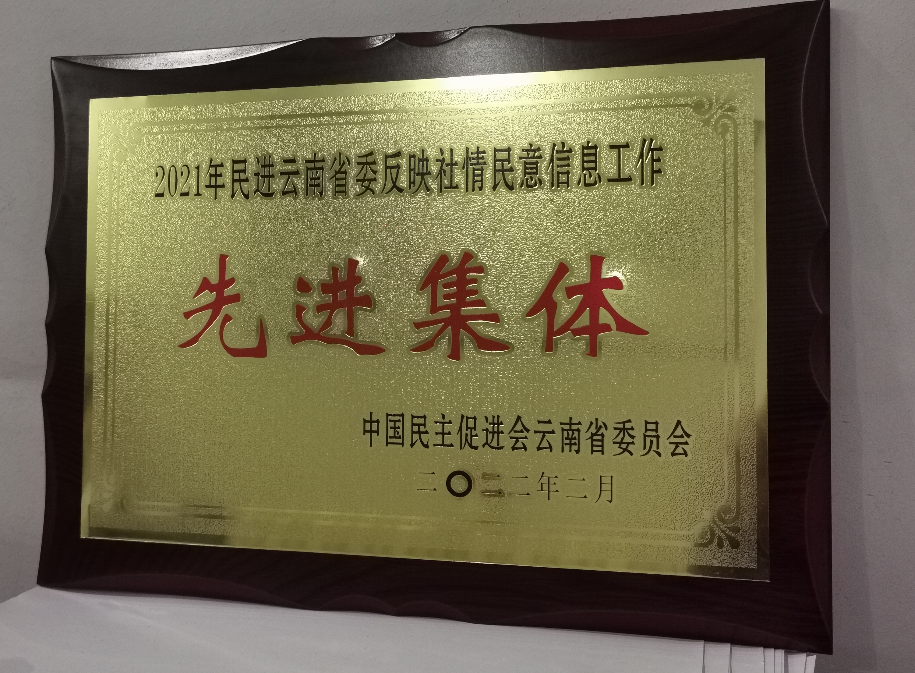 在2022年2月20日召开的中国民主促进会云南省第八届委员会第六次全体(扩大)会议上,中国民主促进会bwin必赢唯一官方网站支部获2021年民进云南省委反映社情民意信息工作“先进集体”表彰。